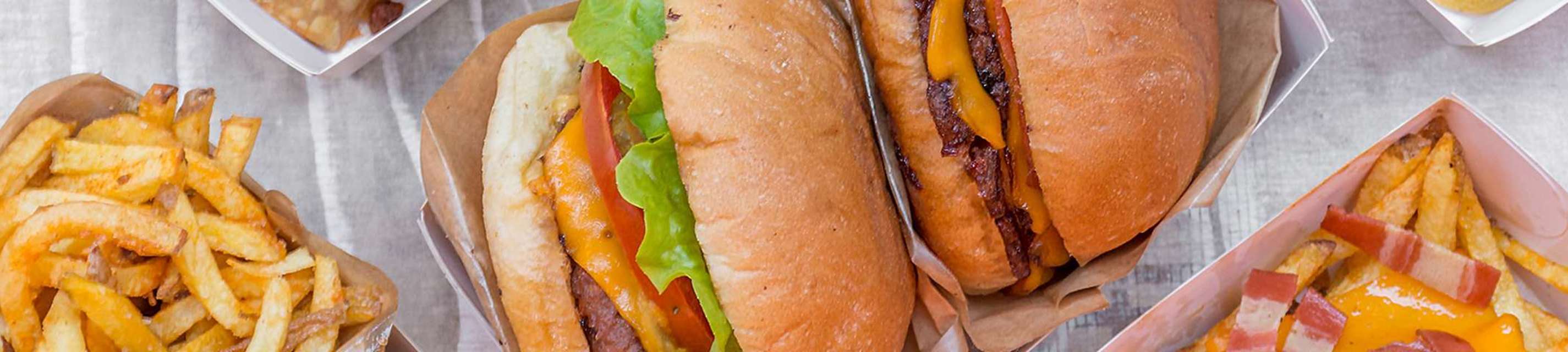 200g wołowiny, roszponka, cebula, pomidor, ogórek kiszony, ser cheddar i sos miodowo--musztardowy